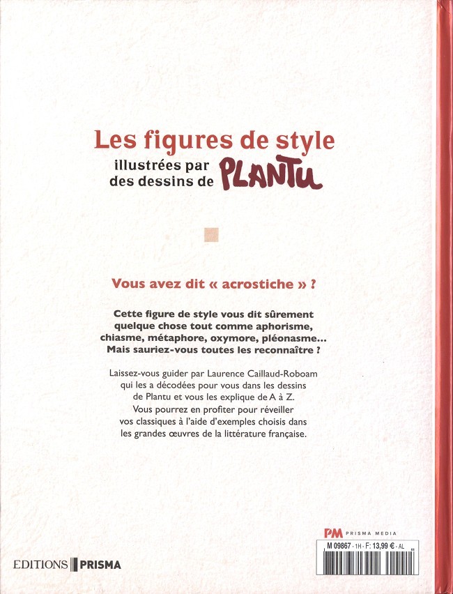 Cette figure de style vous dit sûrement quelque chose tout comme aphorisme, chiasme, métaphore, oxymore, pléonasme... Mais sauriez-vous toutes les reconnaître ? Laissez-vous guider par Laurence Caillaud-Roboam qui les a décodées pour vous dans les dessins de Plantu et vous les explique de A à Z. Vous pourrez en profiter pour réveiller vos classiques à l'aide d'exemples choisis dans les grandes œuvres de la littérature française.