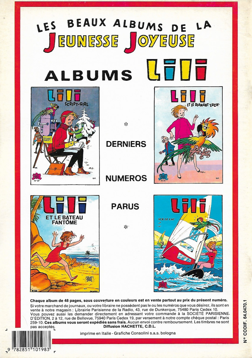 Info édition : DL 4° trimestre 1986 - Dernier titre de Lili paru (au 2° plat) : n°55 (Lili et le bateau fantôme), sorti en 1986.