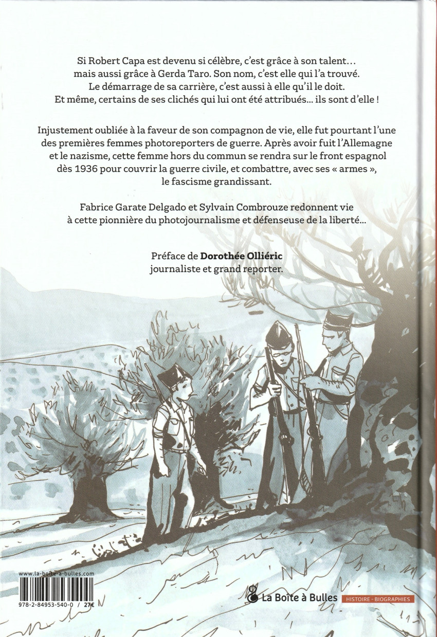 Gerda Taro, jeune reporter, compagne de Robert Capa et qui fut celle qui lui trouva son pseudonyme, est trop longtemps restée dans l'ombre de son compagnon, alors qu'elle fut l'une des premières photoreporters de guerre. Après avoir fuit l'Allemagne et le nazisme, cette jeune femme à la forte personnalité et femme libre se rendra sur les front de la guerre civile d'Espagne afin de combattre avec ses armes le fascisme grandissant.