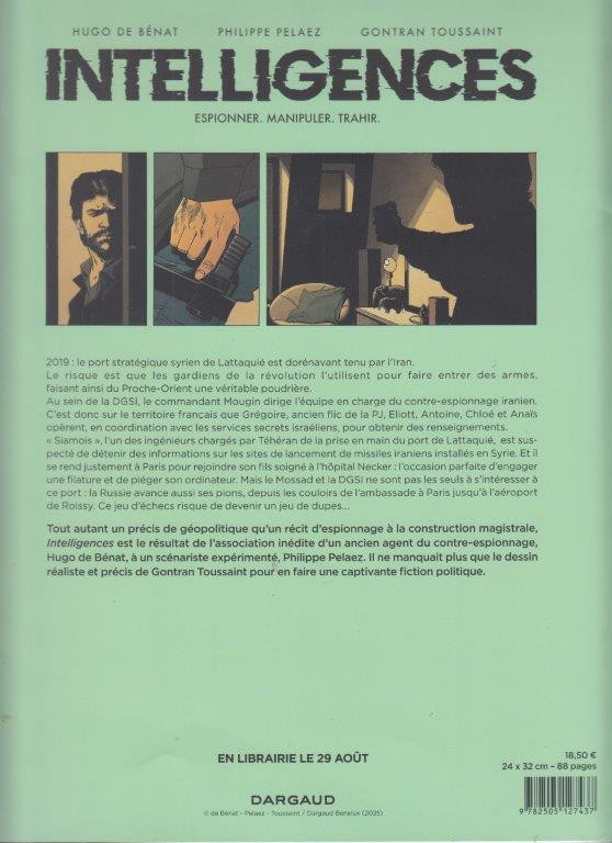 2019 : le port stratégique syrien de Lattaquié est dorénavant tenu par l'Iran. Le risque est immense que les gardiens de la révolution l'utilisent pour faire entrer des armes, faisant ainsi du Proche-Orient une véritable poudrière. Au sein de la DGSI, le commandant Mougin dirige l'équipe en charge du contre-espionnage iranien. C'est donc sur le territoire français que Grégoire, ancien flic de la PJ, Eliott, Antoine, Chloé et Anaïs opèrent, en coordination avec les services secrets israéliens, pour obtenir des renseignements. « Siamois », l'un des... Lire la suite