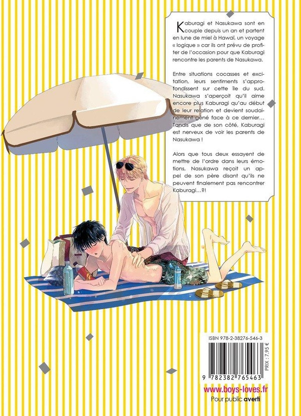 Kaburagi et Nasukawa sont en couple depuis un an et partent en lune de miel à Hawaï, un voyage '' logique '' car ils ont prévu de profiter de l'occasion pour que Kaburagi rencontre les parents de Nasukawa. Entre situations cocasses et excitation, leurs sentiments s'approfondissent sur cette île du sud. Nasukawa s'aperçoit qu'il aime encore plus Kaburagi qu'au début de leur relation et devient soudainement gêné face à ce dernier... Tandis que de son côté, Kaburagi est nerveux de voir les parents de Nasukawa ! Alors que tous deux essayent de mettre... Lire la suite