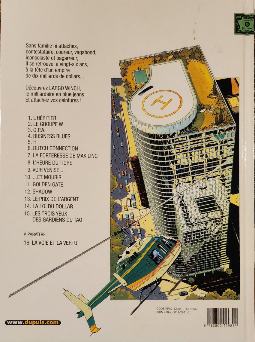 Toutes les cases sont tiquées: action, suspense, érotisme, dépaysement. Certains dialogues sont savoureux, le découpage est dynamique, logique. C’est bien fait, cela se lit d’une traite. Bref, une mécanique bien huilée, même si le scénario est cousu de fil blanc avec la rencontre ‘fortuite’ du grand concurrent TV, Ned Baker au début de l’album Mais par définition, Largo Winch, lui-même est un héros assez peu vraisemblable: un séducteur également gentleman incorruptible, mais qui ne peut résister à aider une jeune demoiselle en détresse. Bref, je peux laisser de la marge.