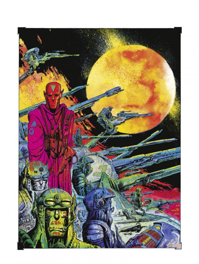 Et parlant des dessins, qu'est-ce que c'est que ça? Attention : ils sont toujours très beaux, souvent impressionnants. Mais c'est quoi tout ce blanc qui entoure les dessins? Pourquoi c'est si petit sur les pages?? C'est quoi tous ces cadres qui remettent le dessin dans des cases? Pourquoi est-ce que tout est aussi carré ou rectangulaire??? Comparez avec les 6 voyages de Lone Sloane ou Delirius, le dessin remplissait souvent la page en entier, parfois ne laissant même aucun blanc sur les côtés! Rien de tout ça ici! Non seulement c'est toujours encadré, ça paraît miniature comparé aux deux albums précédents!