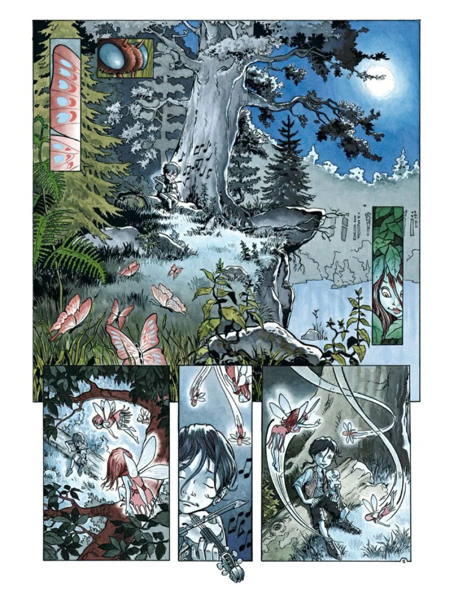 Un dessin très précis, très élaboré et qui vaut le détour mais une historiette qui ramène la poésie et le monde de l'enfance à un niveau très nunuche. Dès le départ, des petits elfes qui viennent te parler dans la forêt, grand-père qui raconte des jolies histoires avec des marionnettes, ouh là là, tout ça est bien fadasse... j'avoue que je ne sais pas si ça va se pimenter un peu, j'ai refermé avant...