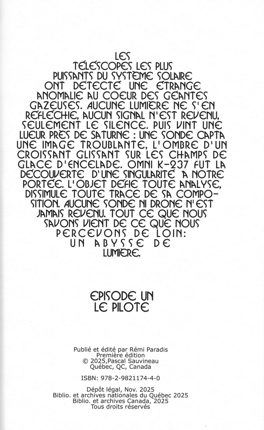 Les télescopes les plus puissants du système solaire ont détecté une étrange anomalie au cœur des géantes gazeuses. Aucune lumière ne s'en réfléchie, aucun signal n'est revenu, seulement le silence. Puis vint une lueur près de Saturne : une sonde capta une image troublante, l'ombre d'un croissant glissant sur les champs de glace d'Encelade. Omni K-237 fur la découverte d'une singularité à notre porté. L'objet défie toute analyse, dissimule toute trace de sa composition. Aucune sonde ni drone n'est jamais revenu. tout ce que nous savons vient de... Lire la suite