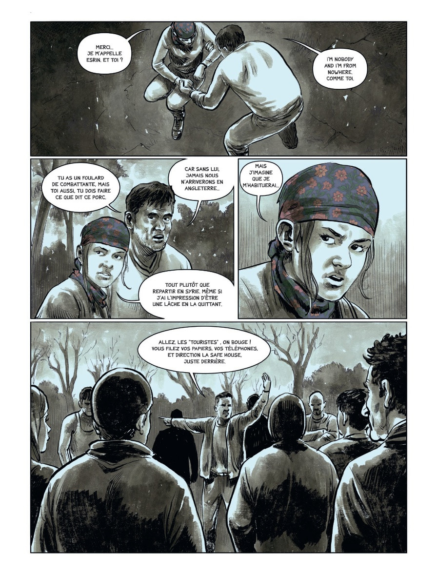 Awar le taiseux porte des baskets de luxe grâce à son lucratif job de passeur. Mais il porte aussi un douloureux passé que va réveiller Esrin, une jeune migrante kurde, fille de combattante fuyant l'enfer syrien. Laisser renaître son humanité ou pas ? Awar va devoir choisir... Car Soran, son boss, veut du chiffre et du résultat. Et Awar, plus tout jeune, voit bien que Musta, passeur ultraviolent fraîchement arrivé, lui prendrait volontiers sa place... Awar va-t-il oser prendre la porte de la rédemption ou la claquer définitivement ? Un récit explorant... Lire la suite