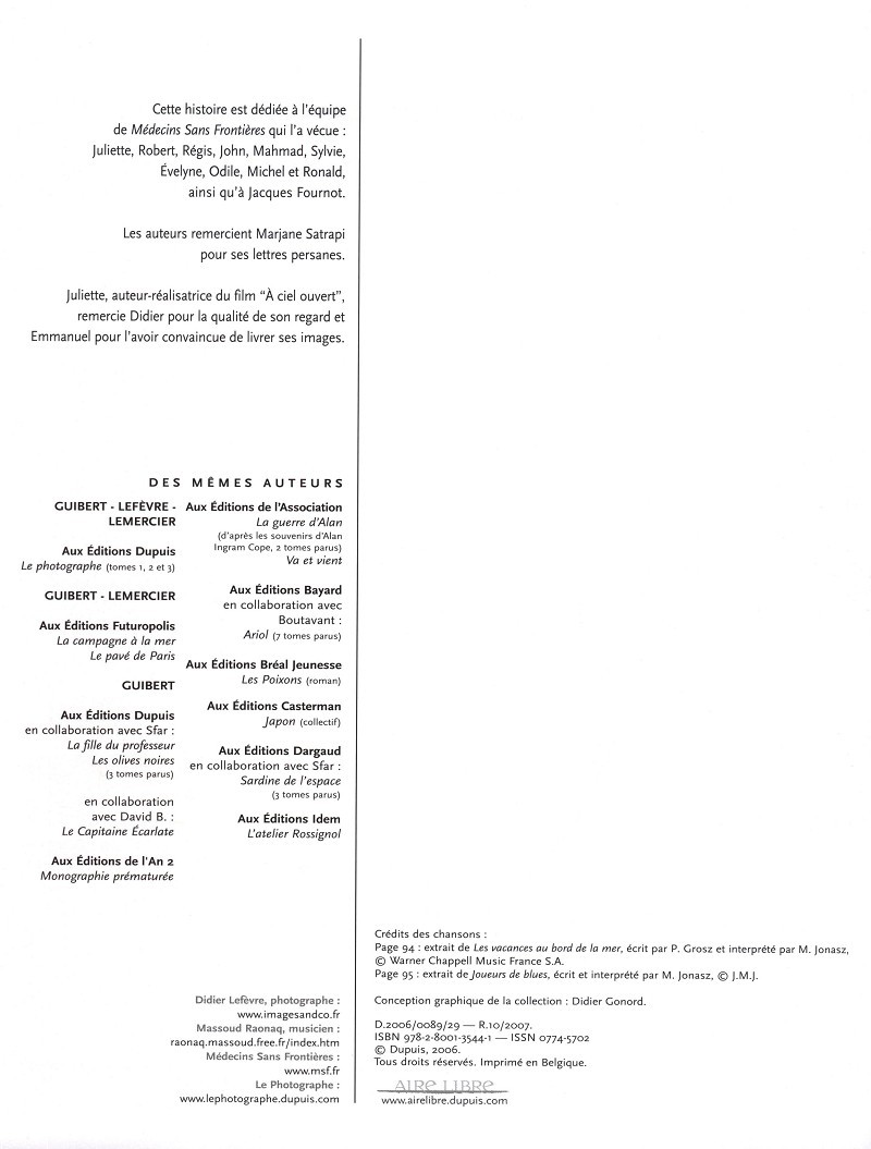 Cet album compte non seulement 20 pages de plus que les précédents, mais contient même un DVD bonus avec un reportage prenant de 40 minutes, tourné par Juliette Fournot au cours de la mission MSF. En annexe on retrouve également un aperçu des héros de ce récit et des informations concernant ce qu'ils sont devenus.