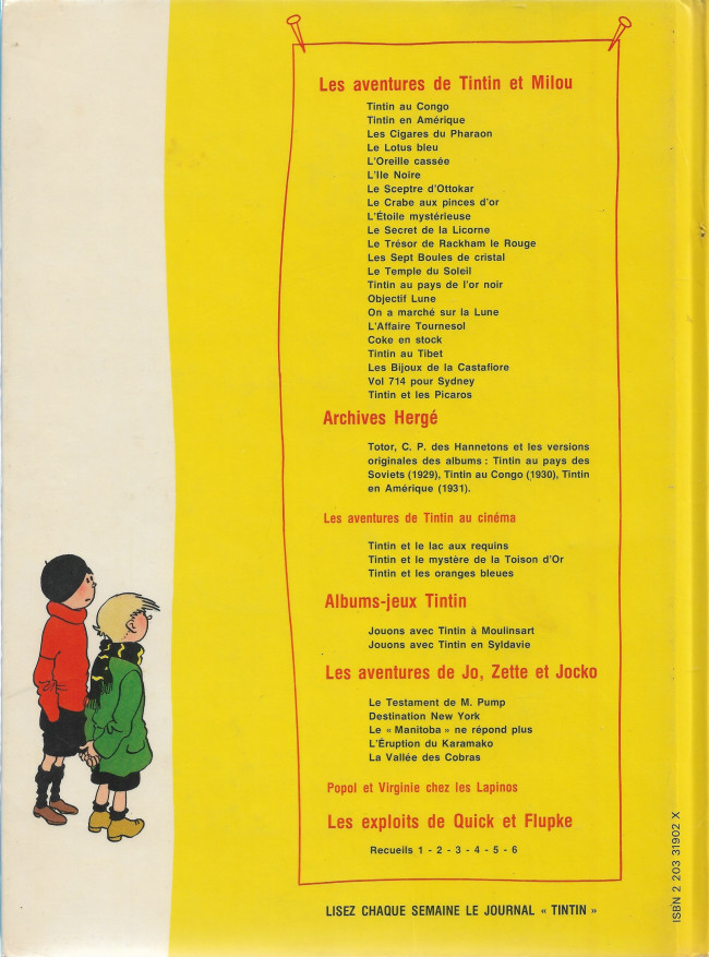 Info édition : Imprimé en Belgique par Casterman, s.a, Tournai, août 1982 n°édit.-impr.2012. Dépôt légal : 2e trimestre 1975; D. 1975/0053/60 en page 62 - Au verso : 6 titres de Quick et Flupke. Les albums- jeux Tintin ne sont pas listés au 2ème plat.