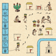 Cet effet d’opposition est renforcé par l’alternance de planches " classiques " et de doubles pages pictographiques, avec de véritables glyphes de la langue nahuatl. Le tout dans un format carré au papier parcheminé.