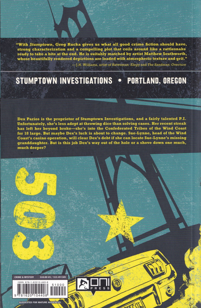 Dex is the proprietor of Stumptown Investigations, and a fairly talented P.I. Unfortunately, she's less adept at throwing dice than solving cases. Her recent streak has left her beyond broke and she's into the Confederated Tribes of the Wind Coast for 18 large. But maybe Dex's luck is about to change. Sue-Lynne, head of the Wind Coast's casino operation, will clear Dex' debt if she can locate Sue-Lynne's missing granddaughter. But is this job Dex's way out of the hole or a shove down one much much deeper?