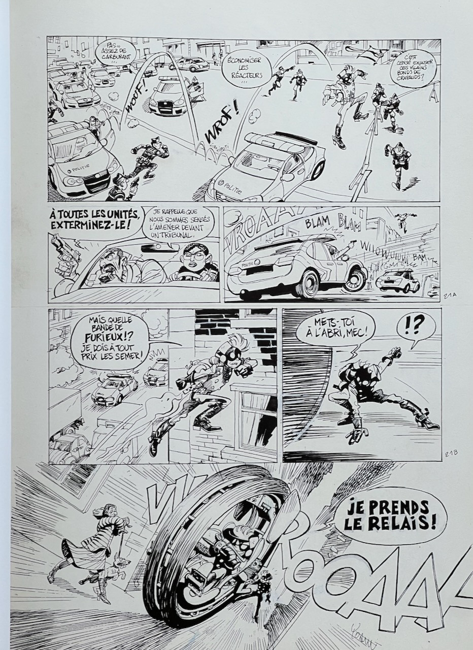 On a donc un Spirou très réussi qui navigue entre crise de l’age adulte, boboisation et (idée géniale) perte d’intérêt du public pour ses aventures face à la vague super-héroïque dans les BD! J’adore cette mise en abyme du personnage à la fois héros de BD et personnage sorti du cadre et soumis au réalisme des auteurs. Poussé malgré lui à endosser le rôle d’un justicier masqué, plus tendance, il fait appel à Champignac pour lui concevoir équipement et pouvoirs adaptés à la tache. Et l’on se dit que le bonhomme en livrée rouge n’a décidément jamais eu à rougir devant un homme chauve-souris… Équipé de son jet-pack il se met à parcourir une Bruxelles soumise aux manigances de politiciens et de magnats du bâtiment véreux. Nouvelle mise en abyme avec cette capitale belge victime comme toutes les grandes villes de la spéculation immobilière… qui mets les populations fragiles en difficultés devant tant de rapacité. Et il n’en fallait pas moins pour que Spirou, en super-héros ou pas, se sente tenu par le devoir! A série spécifique, très peu de personnages secondaires habituels dans cet album mais beaucoup de scènes d’action très bien dessinées, de l’humour qui fonctionne, bref un très bon spirou. La première moitié est particulièrement efficace avec un mode « la vie quotidienne d’un héros » et l’album faiblit un peu dès que les aventures de Super-groom débutent, du fait de cet alter-ego pas très intéressante car un peu cliché. Spirou n’est jamais aussi bon que quand il est face à un vrai méchant patibulaire type Zorglub ou Vito la déveine et cet album manque un peu d’adversité. Ce qui risque d’être réglé dès le prochain épisode au vu de l’épilogue très… percutant! Au final une aventure qui satisfera les amateurs de Bruxelles et de Spirou mais qui pourra avoir du mal à convaincre de nouveaux lecteurs.