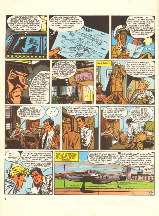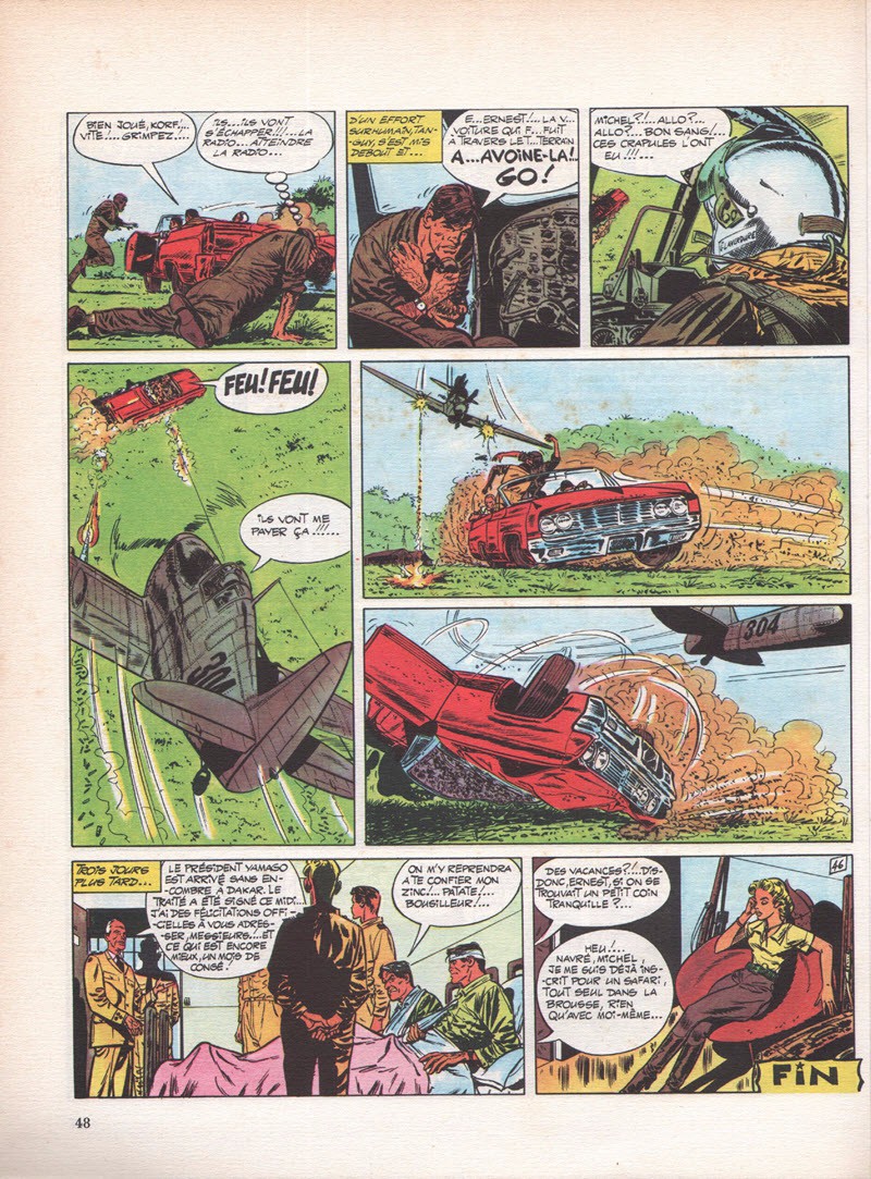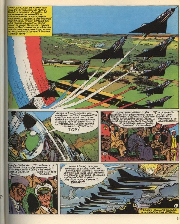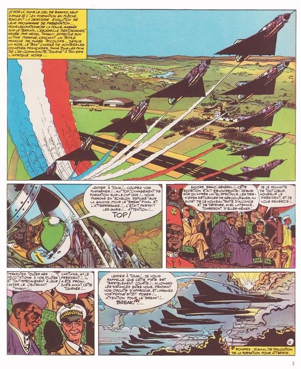 L'idée que l'on retire de cette bd est: simple et efficace. En effet, le scénario de Charlier nous offre des rebondissements, de l'action, de l'humour et de bons dialogues. Chacunes de peripeties de nos heros n'est pas vaine et sert l'histoire. Celle ci, liée a l'actualite du moment, nous entraine en afrique, ou un traité va etre signe avec la france. Cependant, une organisation tente d'empecher cela en abattant l'avion qui transporte le plus fervent dirigeant africain a ce meme traité. Mais les tueurs se trompent d'avion, suite a une annulation de derniere minute! Tanguy et laverdure ayant compris cela, il leur faut maintenant eviter le pire. Un bon episode servi par le beau dessin d'uderzo.