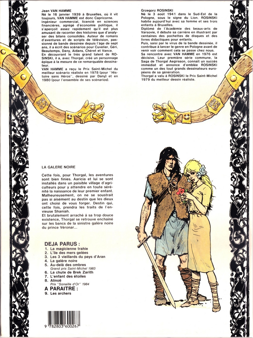 Prépublication dans Tintin édition française dans le n° 285, 288, 291, 294, 297, 300 du 20.02.1981 au 09.06.1981. Une naissance est attendue au foyer de Thorgal et Aaricia ! Mais le valeureux viking n'en fascine pas moins d'autres femmes, et l'une d'elles a juré sa perte. En effet, elle l'accuse d'avoir favorisé l'évasion d'un traître. Emmené à bord de la galère noire du prince Véronar, Thorgal devient alors le jouet des caprices sadiques de ce tyran dégénéré ! Le voila en bien mauvaise posture !