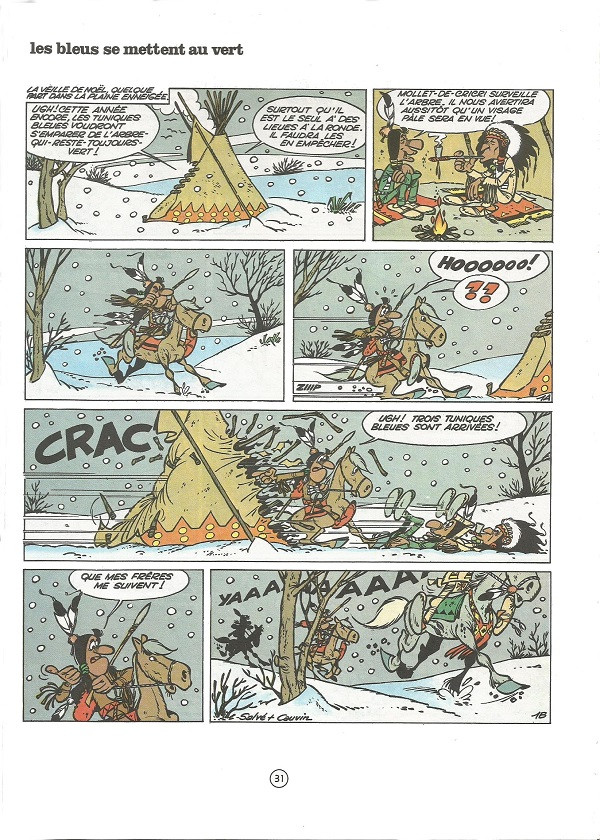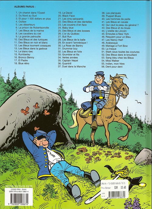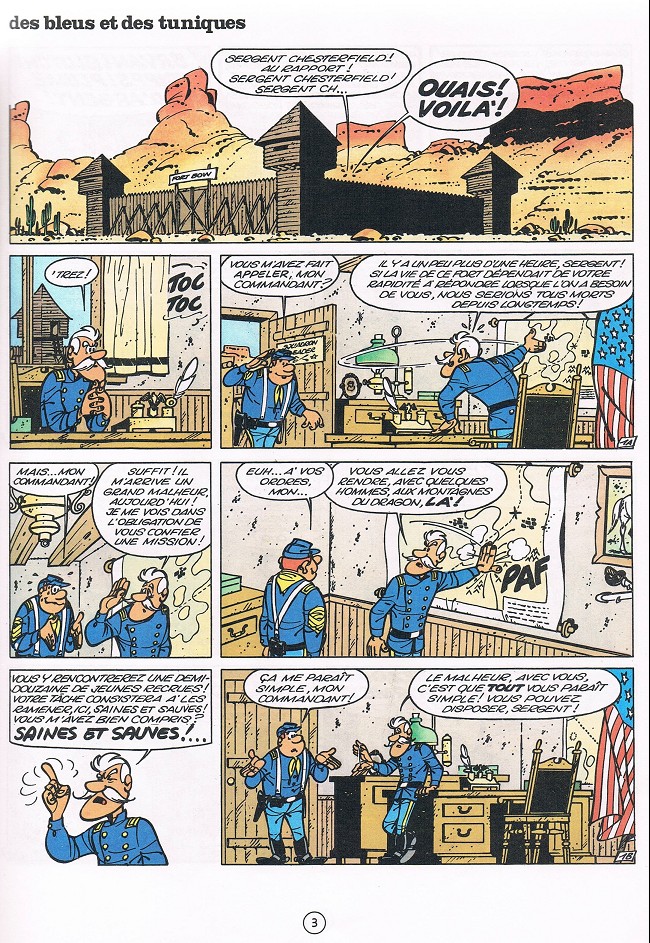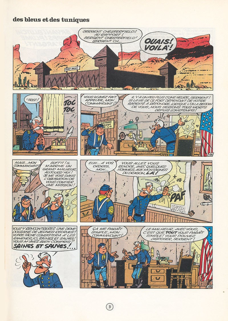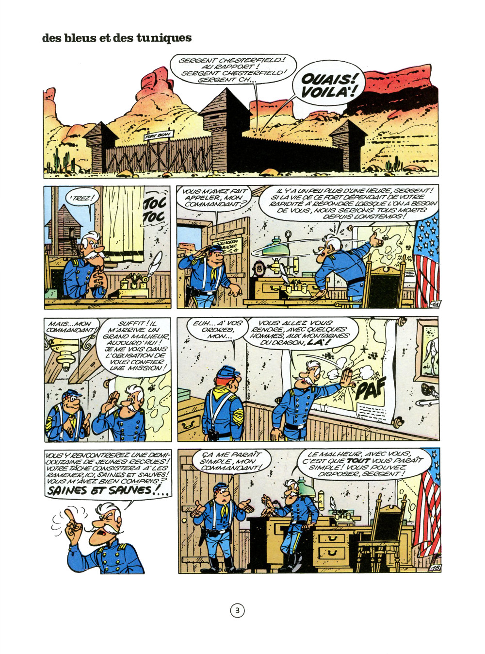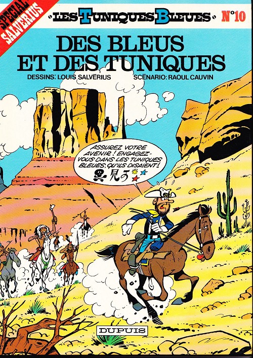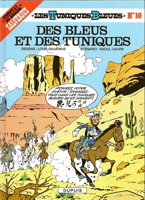 Des bleus et des tuniques : publication dans Spirou (1749 à 1757) en 1971. Le sergent Chesterfield reçoit du commandant Appeltown la mission de ramener au fort une demi-douzaine de jeunes recrues des montagnes du Dragon. Sur le chemin du retour le sergent doit, en outre, en faire des hommes. Pour cela, il demande aux Pueblos, le peuple de Plume d’argent en paix avec les Tuniques bleues, de simuler une attaque afin d’aguerrir la « bleusaille » au combat. Malheureusement, les Comanches, en guerre avec l’armée américaine et désireux de s’emparer du... Lire la suite