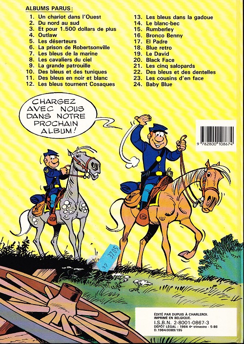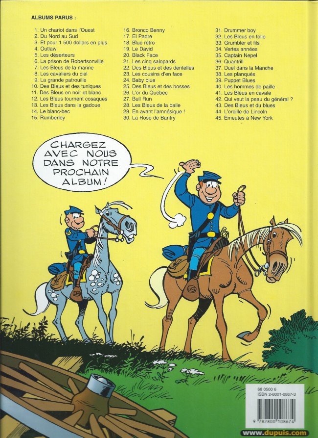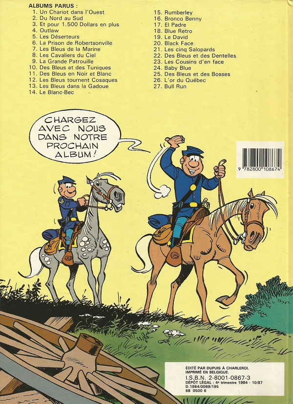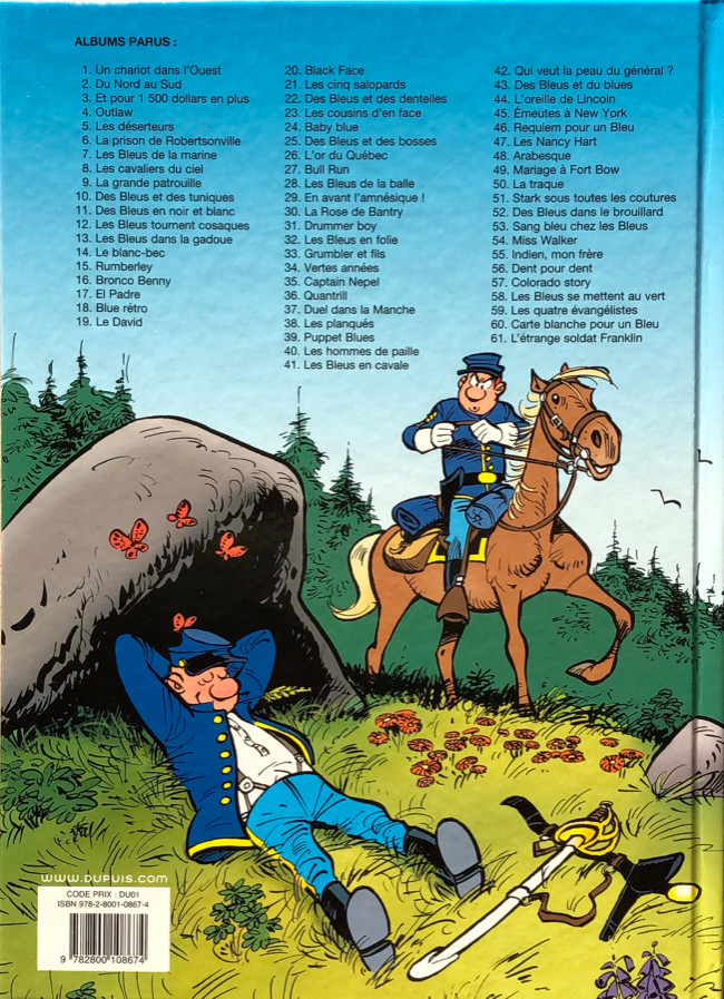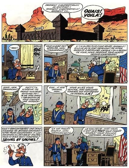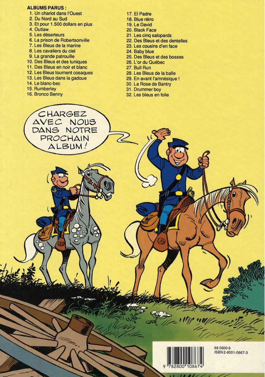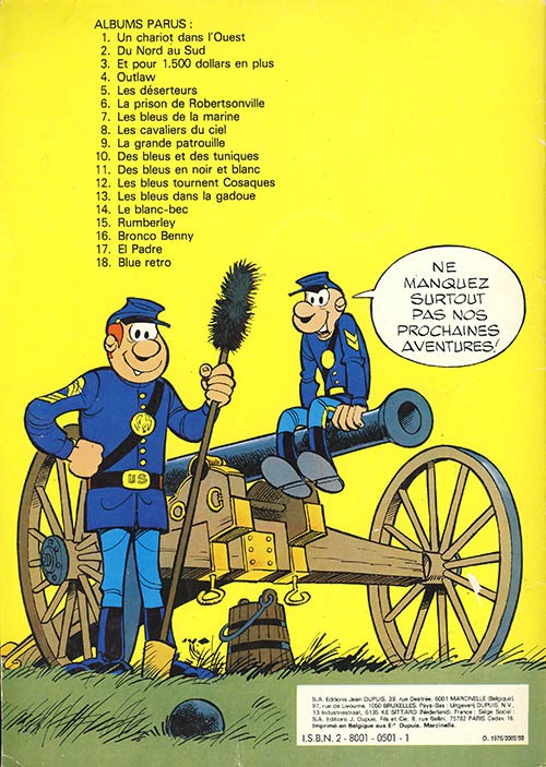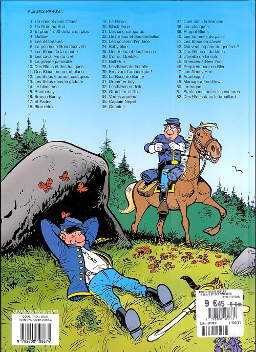 Des bleus et des tuniques : publication dans Spirou (1749 à 1757) en 1971. Le sergent Chesterfield reçoit du commandant Appeltown la mission de ramener au fort une demi-douzaine de jeunes recrues des montagnes du Dragon. Sur le chemin du retour le sergent doit, en outre, en faire des hommes. Pour cela, il demande aux Pueblos, le peuple de Plume d’argent en paix avec les Tuniques bleues, de simuler une attaque afin d’aguerrir la « bleusaille » au combat. Malheureusement, les Comanches, en guerre avec l’armée américaine et désireux de s’emparer du... Lire la suite