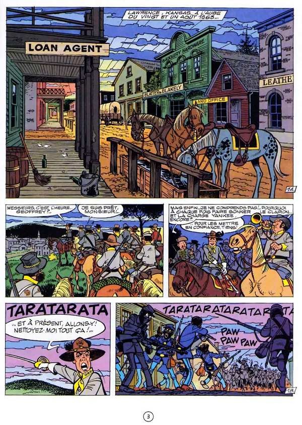 Les auteurs ont-ils été en panne d’inspiration sur cet album ? C’est à se demander. L’histoire est un peu trop lente à mon goût. Le scénario s’attarde sur le personnage de Quantrill, véritable chef de guerre sudiste, véritable pillard, toujours accompagné des frères James. Il est à noter que J.M. Charlier avait déjà évoqué le personnage dans deux albums de la Jeunesse de Blueberry : les démons du Missouri et terreur sur le Kansas.