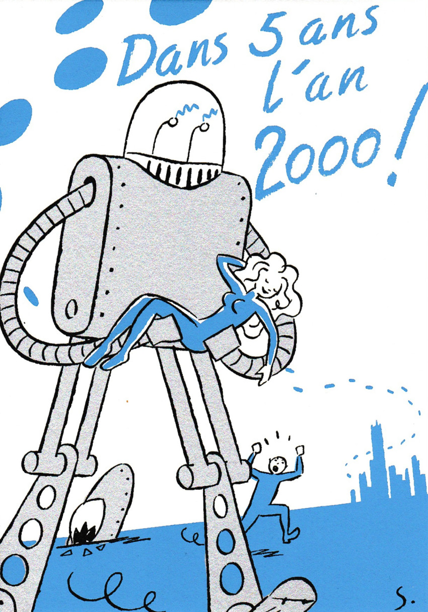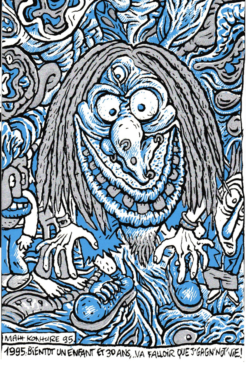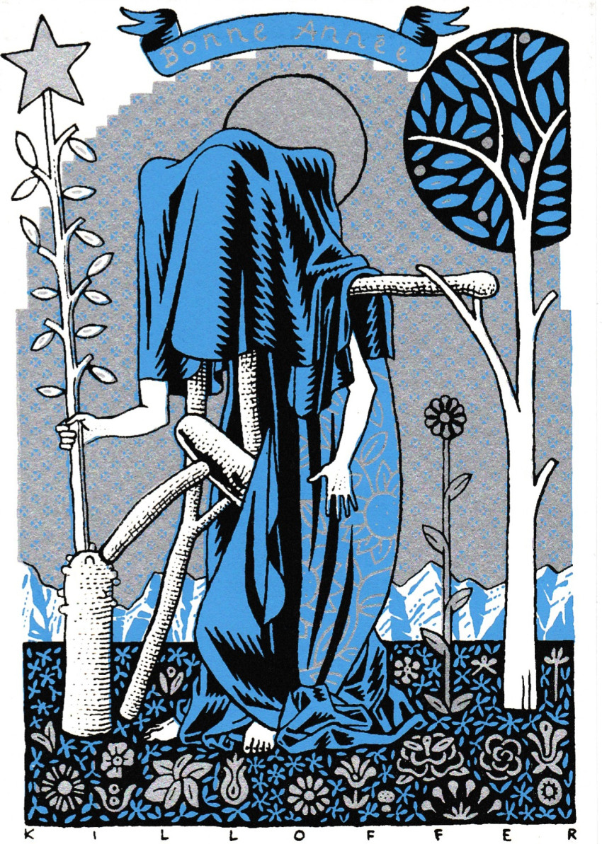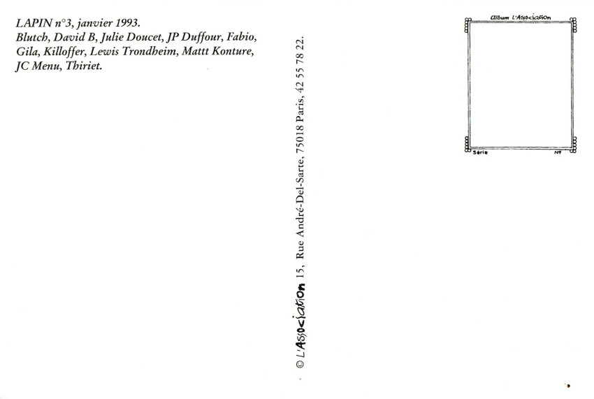 Commentaire : Fait partie d'un lot de 6 cartes de vœux offertes aux adhérents de l'Association (les auteurs : Lewis Trondheim, David B., J.C. Menu, Killoffer, Mattt Konture, Stanislas). Verso non imprimé.