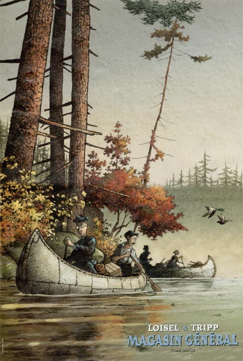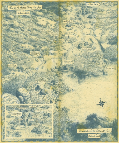 Commentaire : Cette carte de la paroisse de Notre-Dame-des-Lacs, par Loisel et Tripp, fait partie intégrante du premier coffret Magasin général édité par Canal BD. Carte ouverte :H 700 mm; L 587 mm