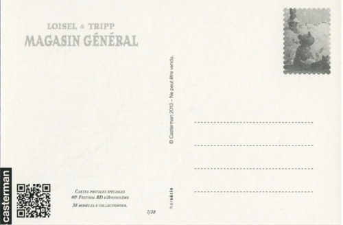Commentaire : Fait partie d'une série de 38 cartes postales éditées pour le 40ème festival BD d'Angoulême en 2013.