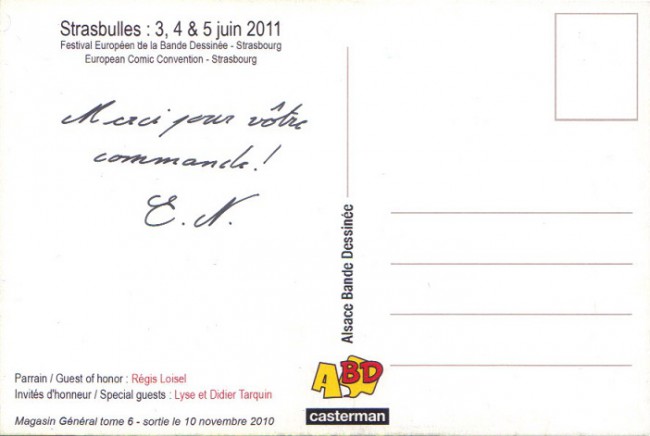 Commentaire : Carte éditée à l'occasion du Festival "Strasbulles" de Strasbourg, du 3 au 5 juin 2011.