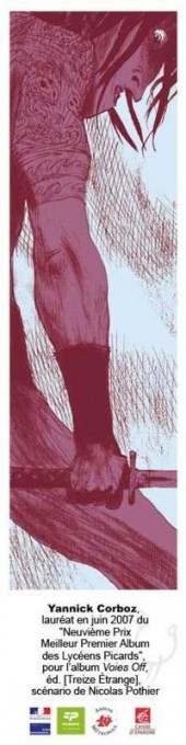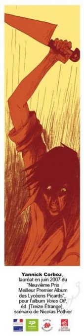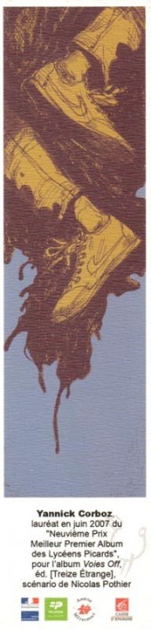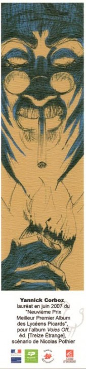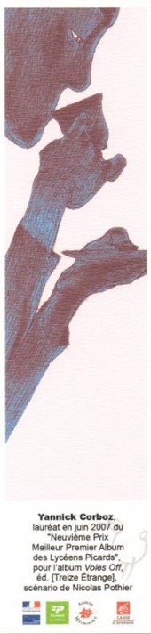 Commentaire : Fait partie d'une série de 10 marque-pages édités à l'occasion du 9ème prix "Meilleur album des lycéens picards" pour l'album Voies off.