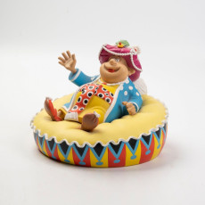 Commentaire : Un des trois ensembles (Dilat Laraht et le canon, Iznogoud devant la porte du palais et Haroun el Poussah et son lit) offerts dans les Magic Box chez Quick en 1997. Le socle (59x70x89) possède un mécanisme qui peut éjecter Dilat Laraht du canon en faisant pivoter sur elle-même la figurine 2D Iznogoud ; cette dernière mesure 31x40x3.