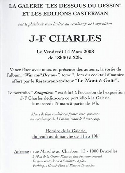 Commentaire : Invitation au vernissage de l'exposition de Jean-François Charles à l'occasion de la sortie du tome 2 de la série War and Dreams du 14 mars 2008.