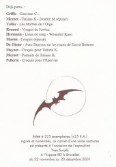 Commentaire : Edité à 225 exemplaires (+25 E.A.) signés et numérotés, ce carnet d'une visite nocturne est présenté à l'occasion de l'exposition Yves Swolfs à l'Espace BD à Bruxelles du 22 novembre au 20 décembre 2001.