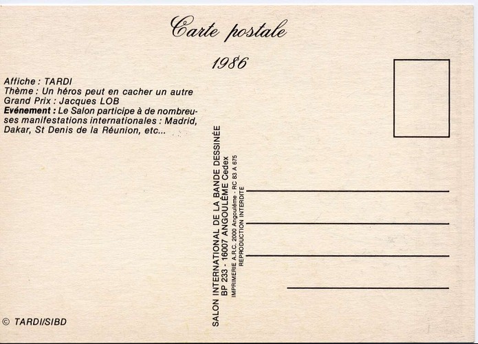 Commentaire : Fait partie des 16 cartes postales contenues dans le portfolio. Reprise de l'affiche du 13ème salon, en 1986.