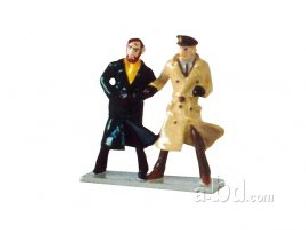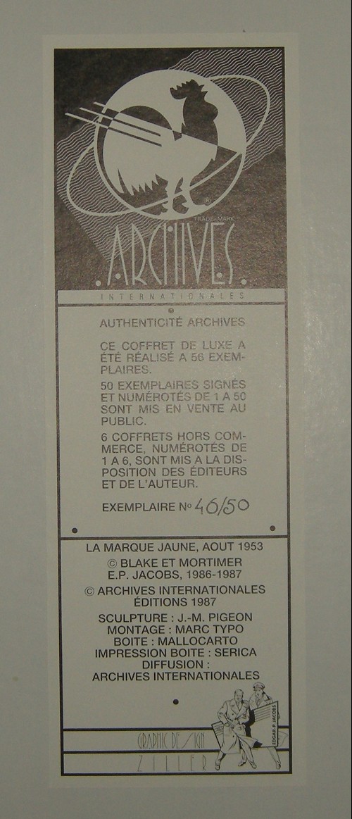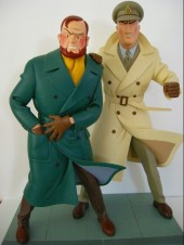 Commentaire : Ces statues ont été fabriquées en 1986, mesurent 44 cm et sont composées de 3 éléments : Blake, Mortimer et le socle. Les deux personnages sont livrés dans 2 superbes boites sérigraphiées. Elles sont également accompagnées de 2 sérigraphies éditées par Archives Internationales dont 1 signée par E.P.Jacobs.