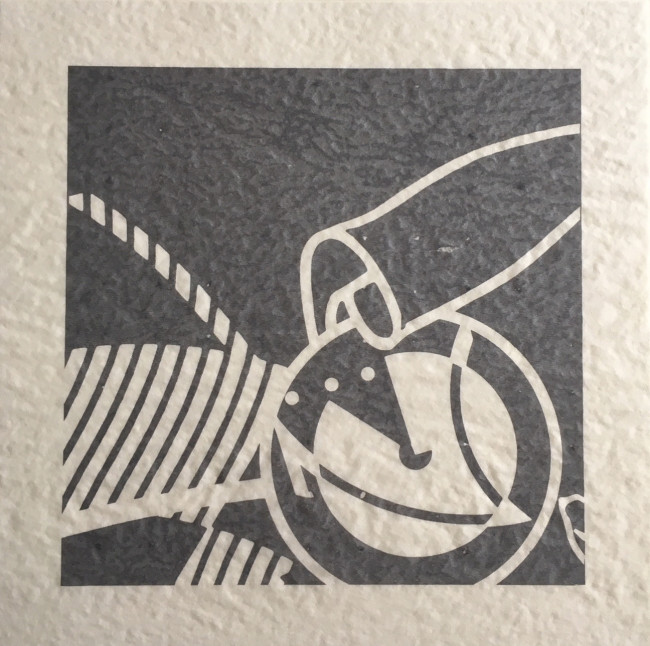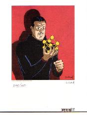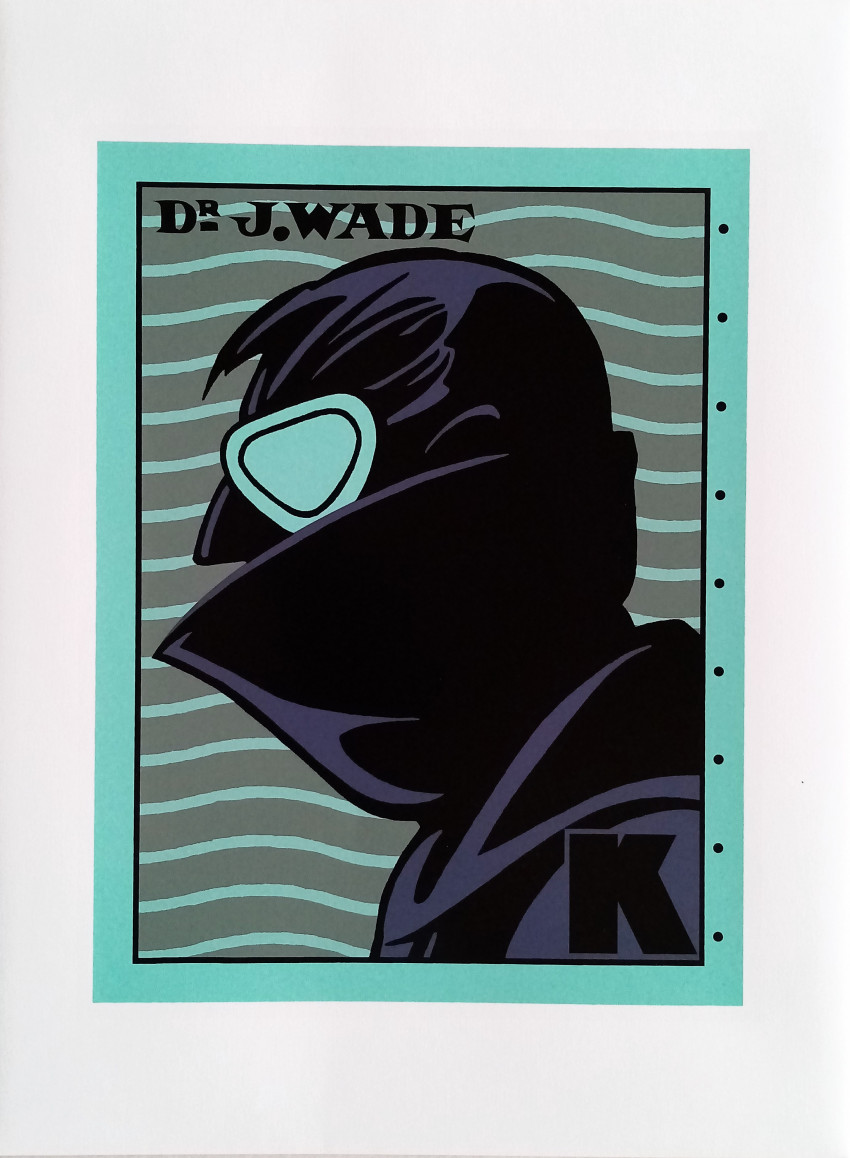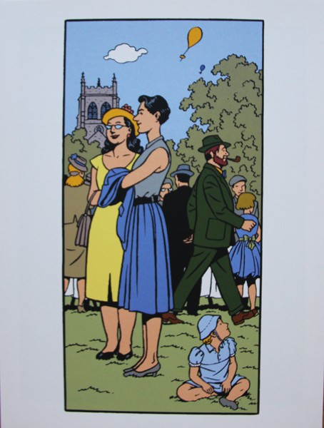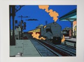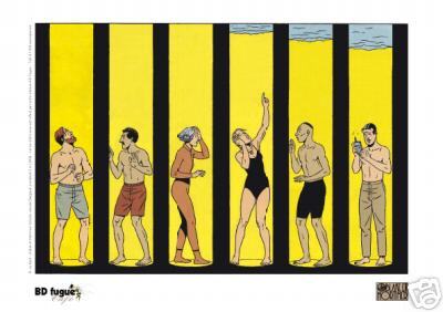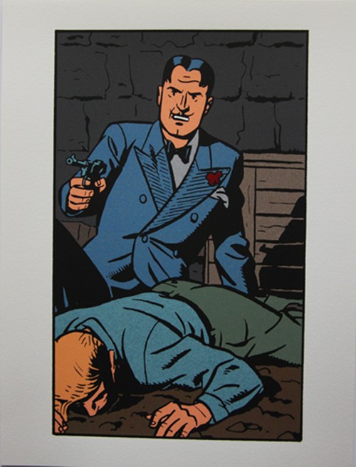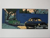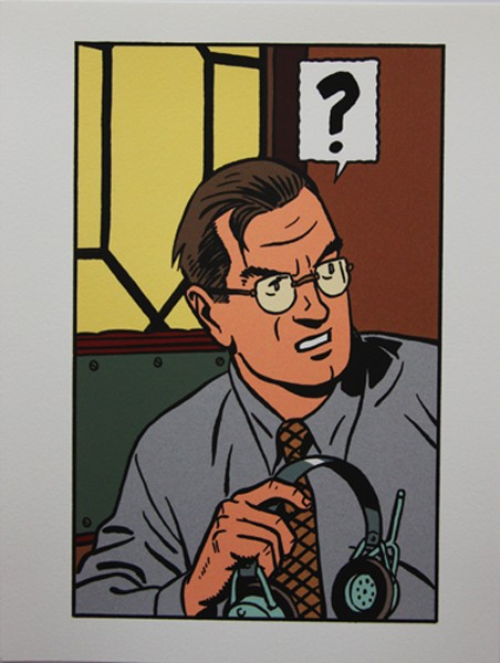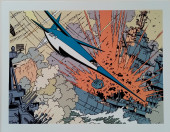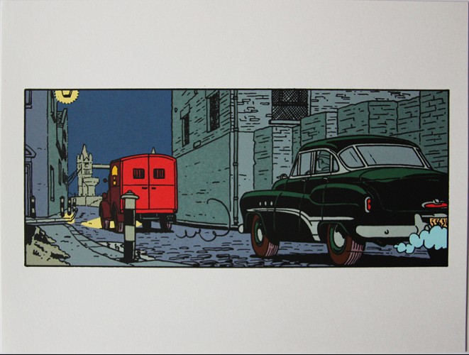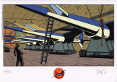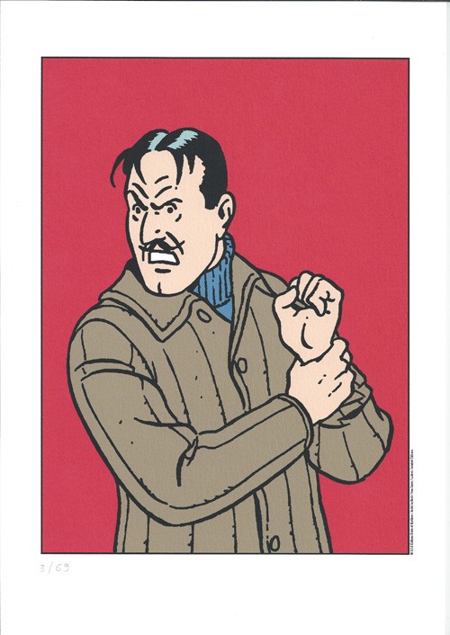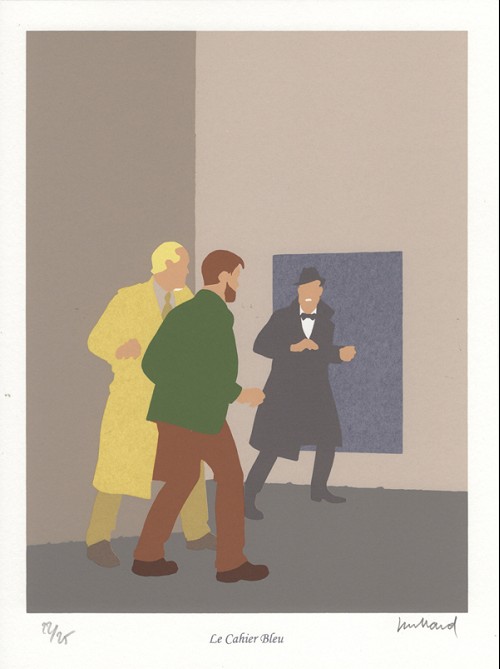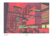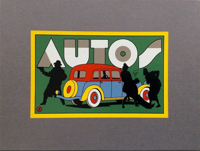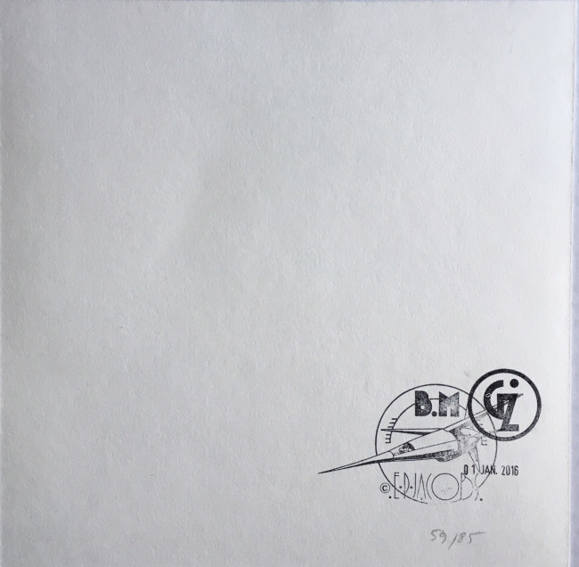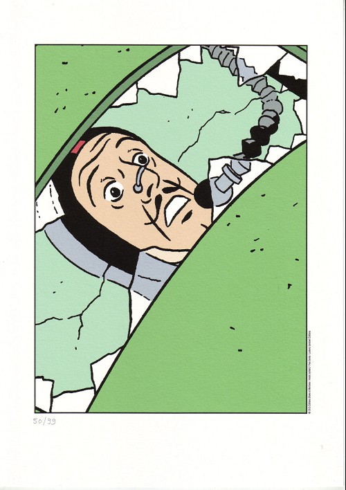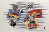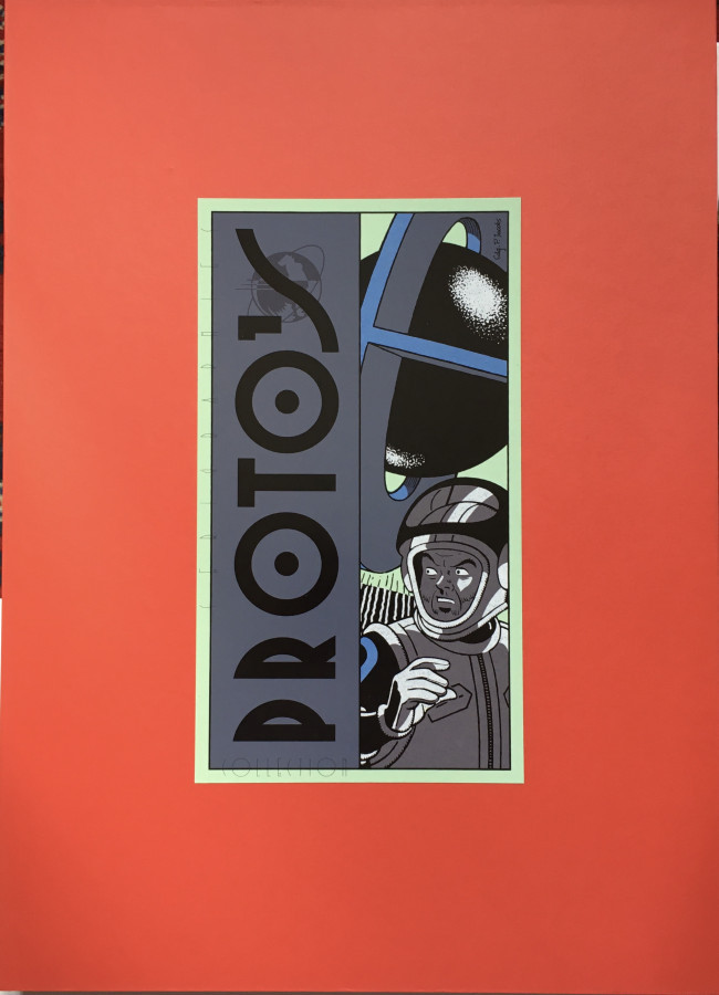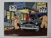 Commentaire : Existe également en 3 versions : Couleurs sérigraphiées (ici), en noir et blanc et version avec trait noir sur film cellulo avec son aplat de couleurs.