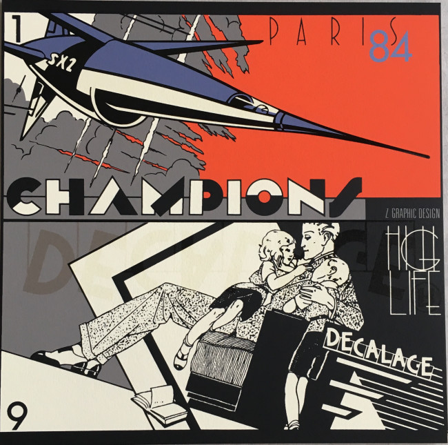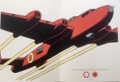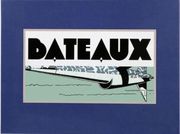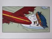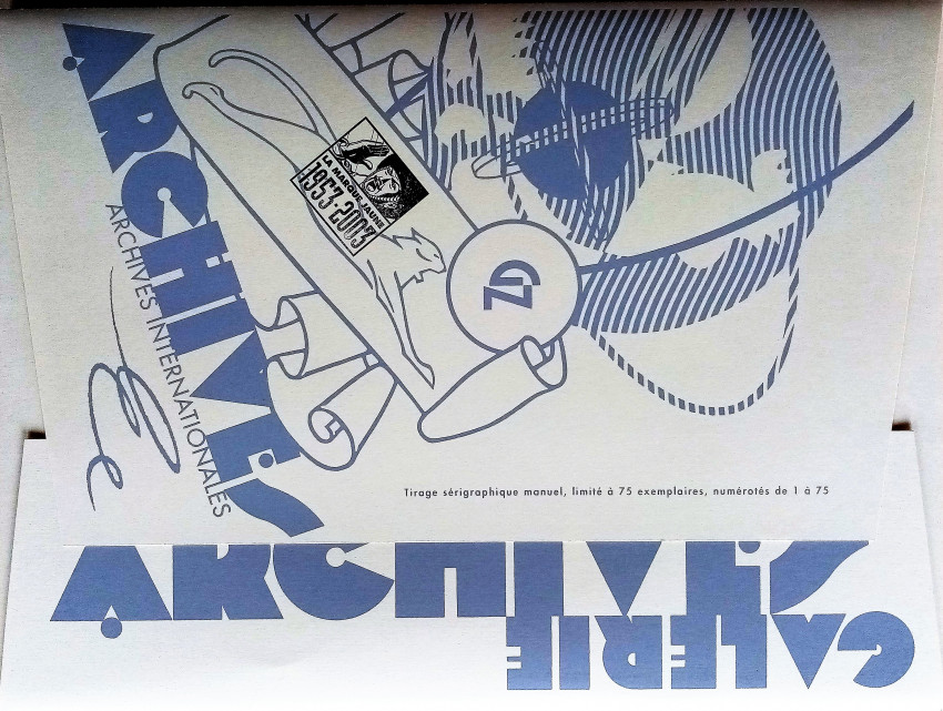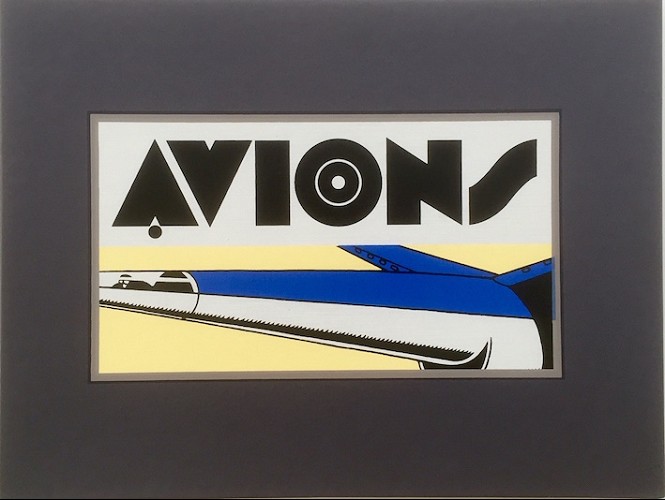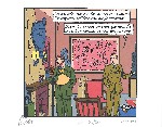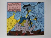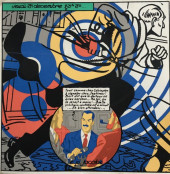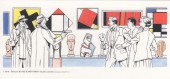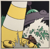 Commentaire : Existe en 3 versions : Couleurs sérigraphiées, en noir et blanc et version avec trait noir sur film cellulo avec son aplat de couleurs (ici).