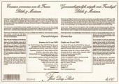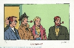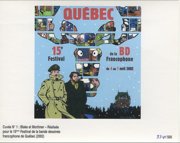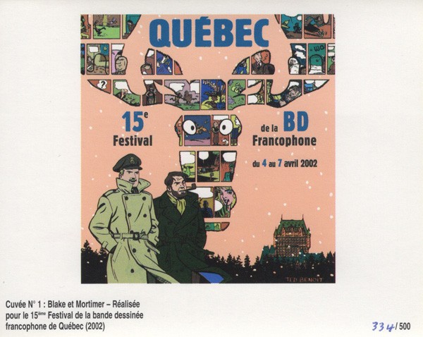 Commentaire : Cuvée n°1 : Blake et Mortimer. Réalisée pour le 15ème festival de la bande dessinée francophone de Québec, en avril 2002. Nom du cépage inconnu.