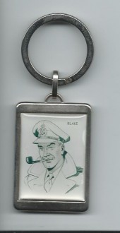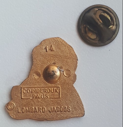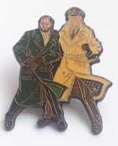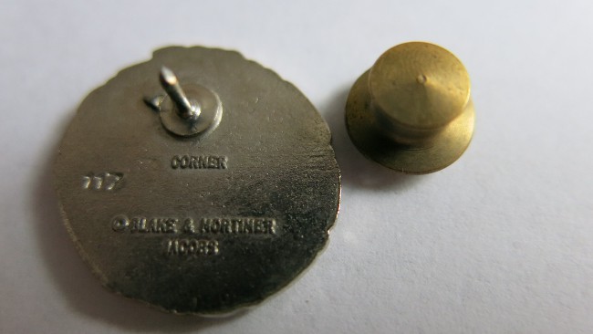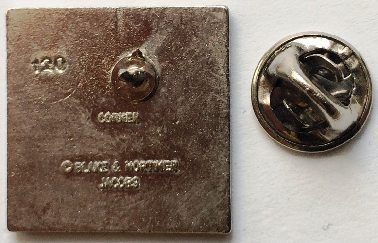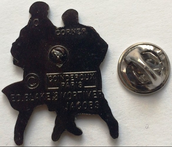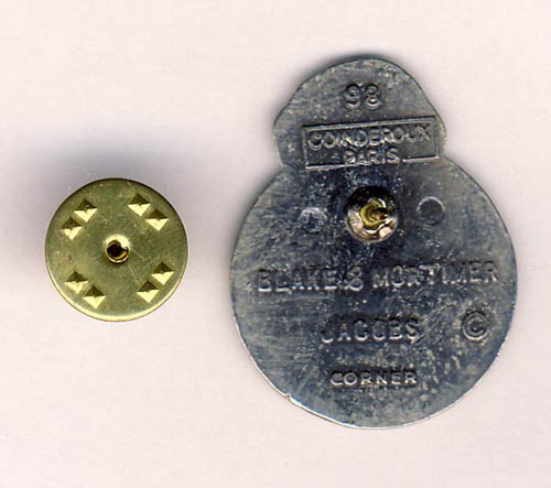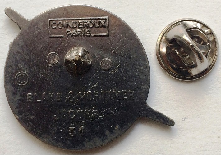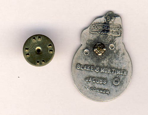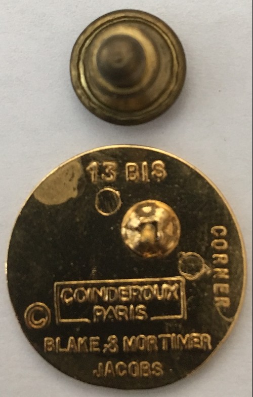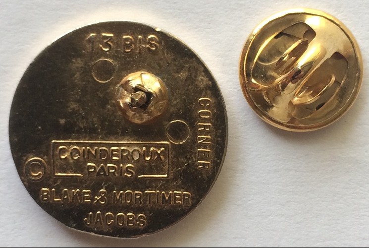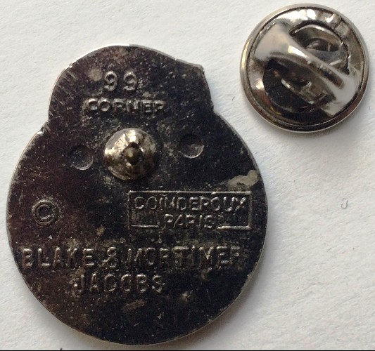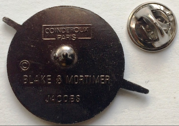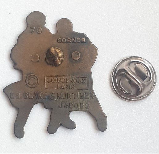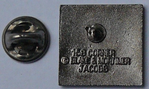 Commentaire : Au dos : 13 bis Coinderoux Paris. Blake et Mortimer JACOBS © CORNER. Attache à pompe, vendu dans une boîte Corner transparente avec fond papier noir. Existe en différentes variantes de support, taille et couleur.