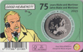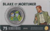 Commentaire : Piece de 5,00 € commémorant le 75ème anniversaire de Blake et Mortimer. La pièce est emballée dans une coincard illustrée en couleur (Gravure : Luc Luycx, diamètre : 30,1mm, poids : 12,7g).
