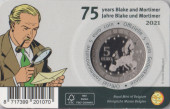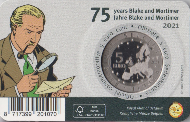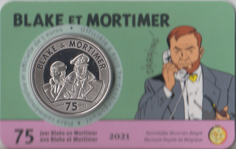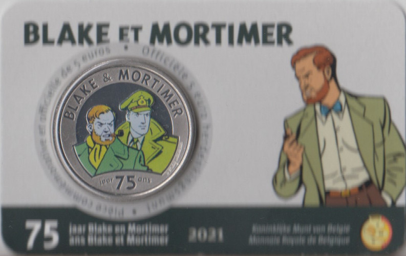 Commentaire : Piece de 5,00 € commémorant le 75ème anniversaire de Blake et Mortimer. La pièce avec coloration est emballée dans une coincard illustrée en noir et blanc (Gravure : Luc Luycx, diamètre : 30,1mm, poids : 12,7g).