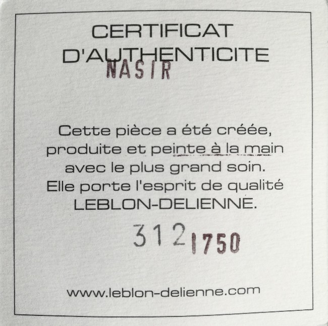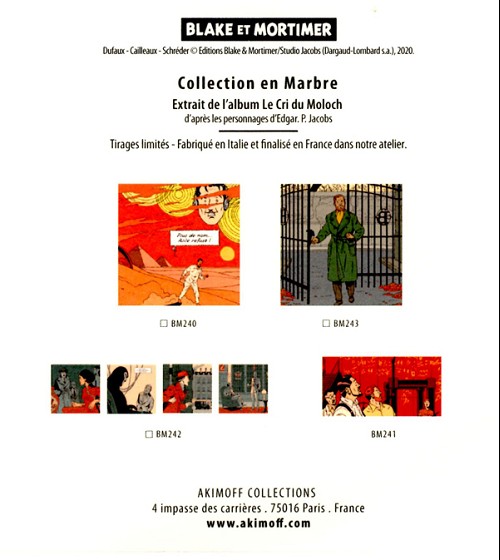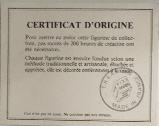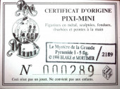 Commentaire : Pas de justificatif de tirage. On peut par contre parfois trouver un "certificat d'authenticité Pixi" à l'intérieur (visuel 2). Boite Kraft. A noter que la statue est gravée sous le socle "Pixi E.P JACOBS Blake et Mortimer 1990" .
