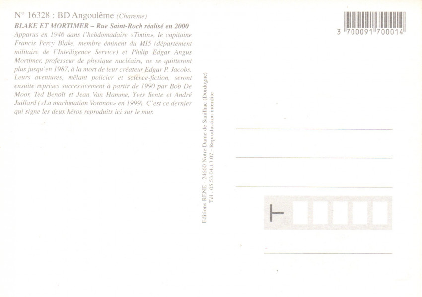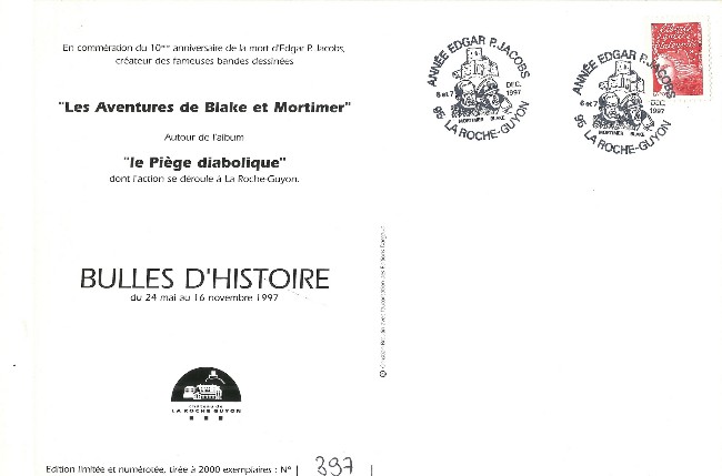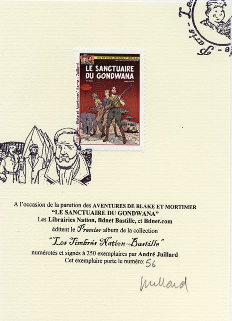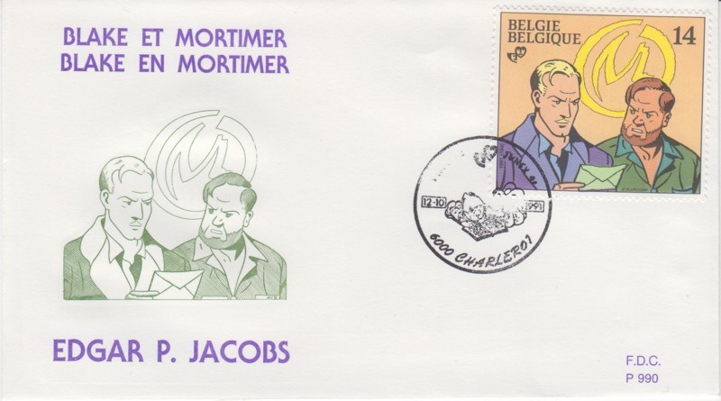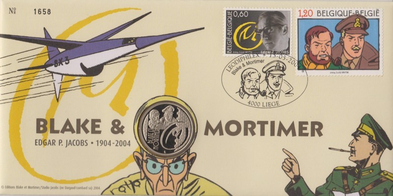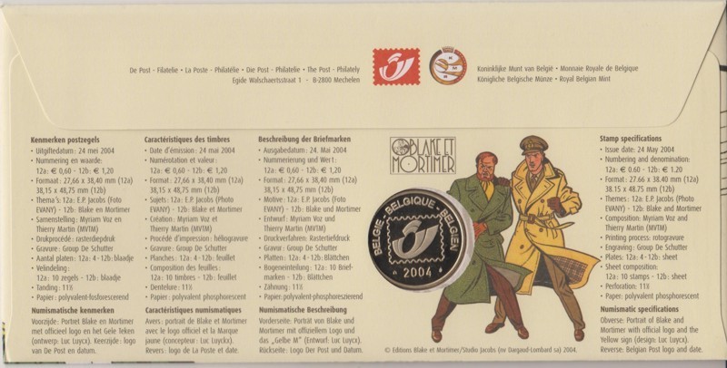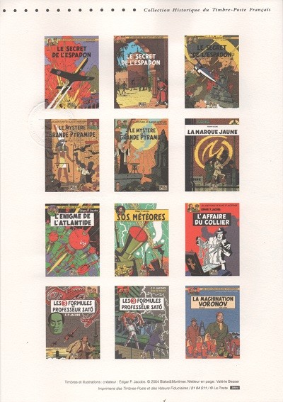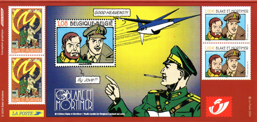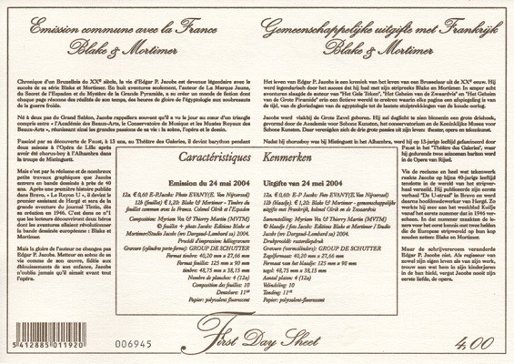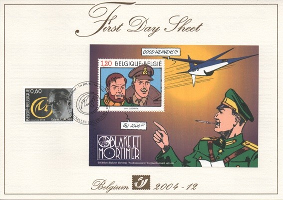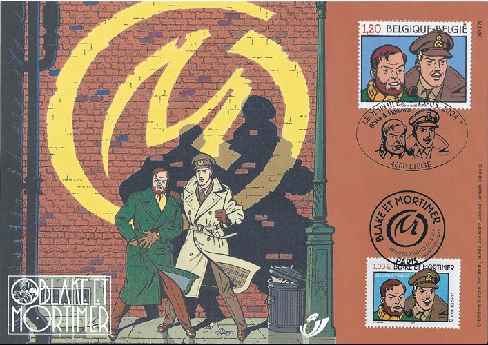 Commentaire : Comprend le bloc Blake et Mortimer et le timbre Jacobs, une oblitération premier jour et une description au verso.