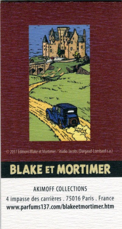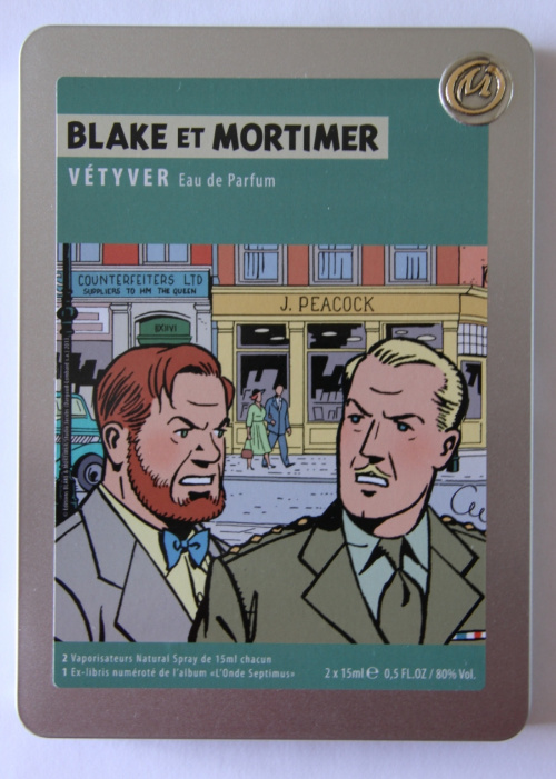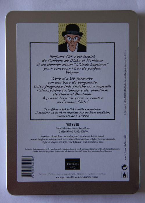 Commentaire : Boite métallique contenant deux vaporisateurs Eau de parfum Vétyver créé par Akimoff (Paris), diffusée par parfum137, qui s'est inspiré de l'univers de Blake et Mortimer et du dernier album "L'Onde Septimus" pour proposer ce parfum sur une base de bergamote.