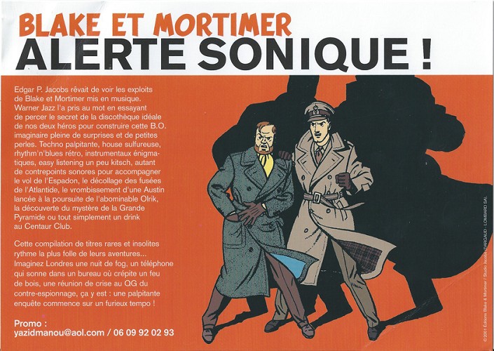Commentaire : Conjointement associé à la sortie en 2001 de l'album "L'étrange rendez-vous", comprend un cahier couleur de 20 pages présentant la série Blake et Mortimer et son auteur. Liste également les 28 morceaux composants ce CD musical.