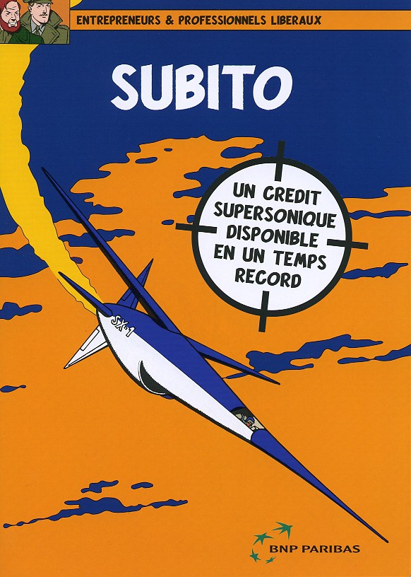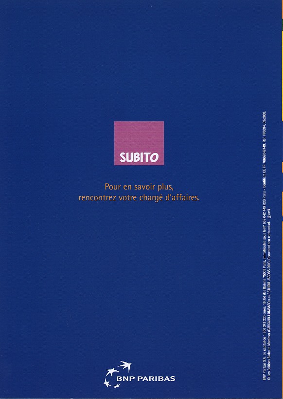 Commentaire : Publicité pour le nouveau crédit SUBITO à destination des entrepreneurs et professionnels libéraux. Publicité en 4 volets recto-verso avec un dessin sur le 3ème volet.