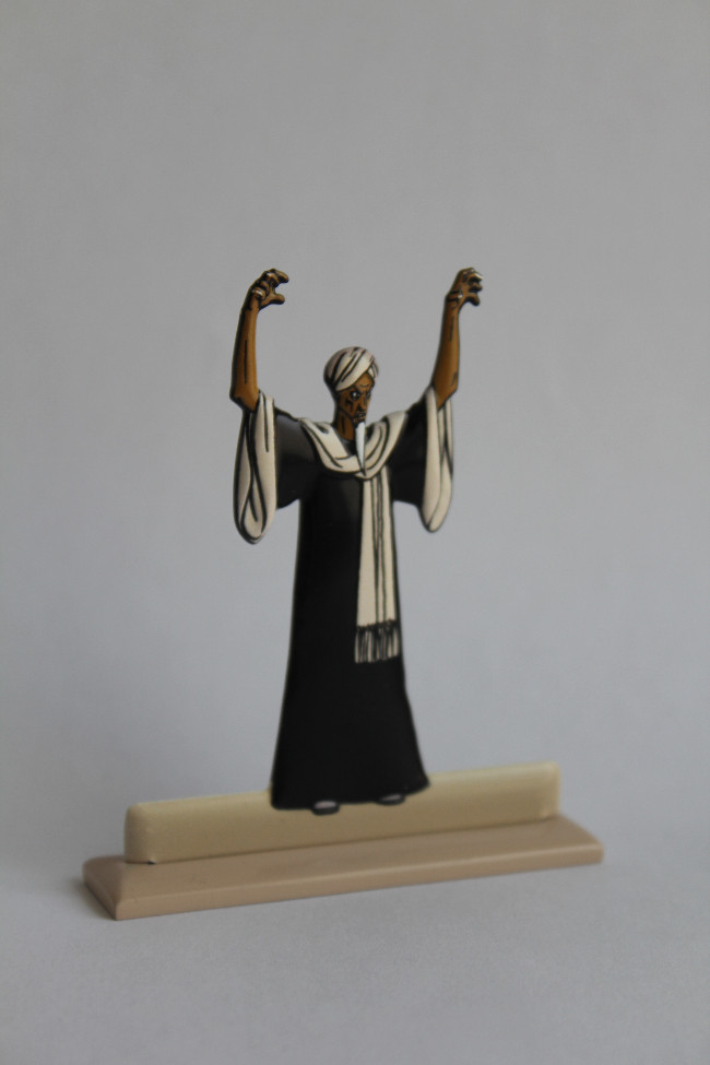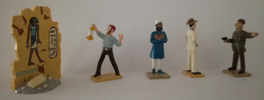 Commentaire : Pixi-Mini. Figurines : Mortimer, Nasir, Commissaire Kamal, Olrik et un morceau de mur peint avec Horus, le Dieu à tête de faucon et des hiéroglyphes.