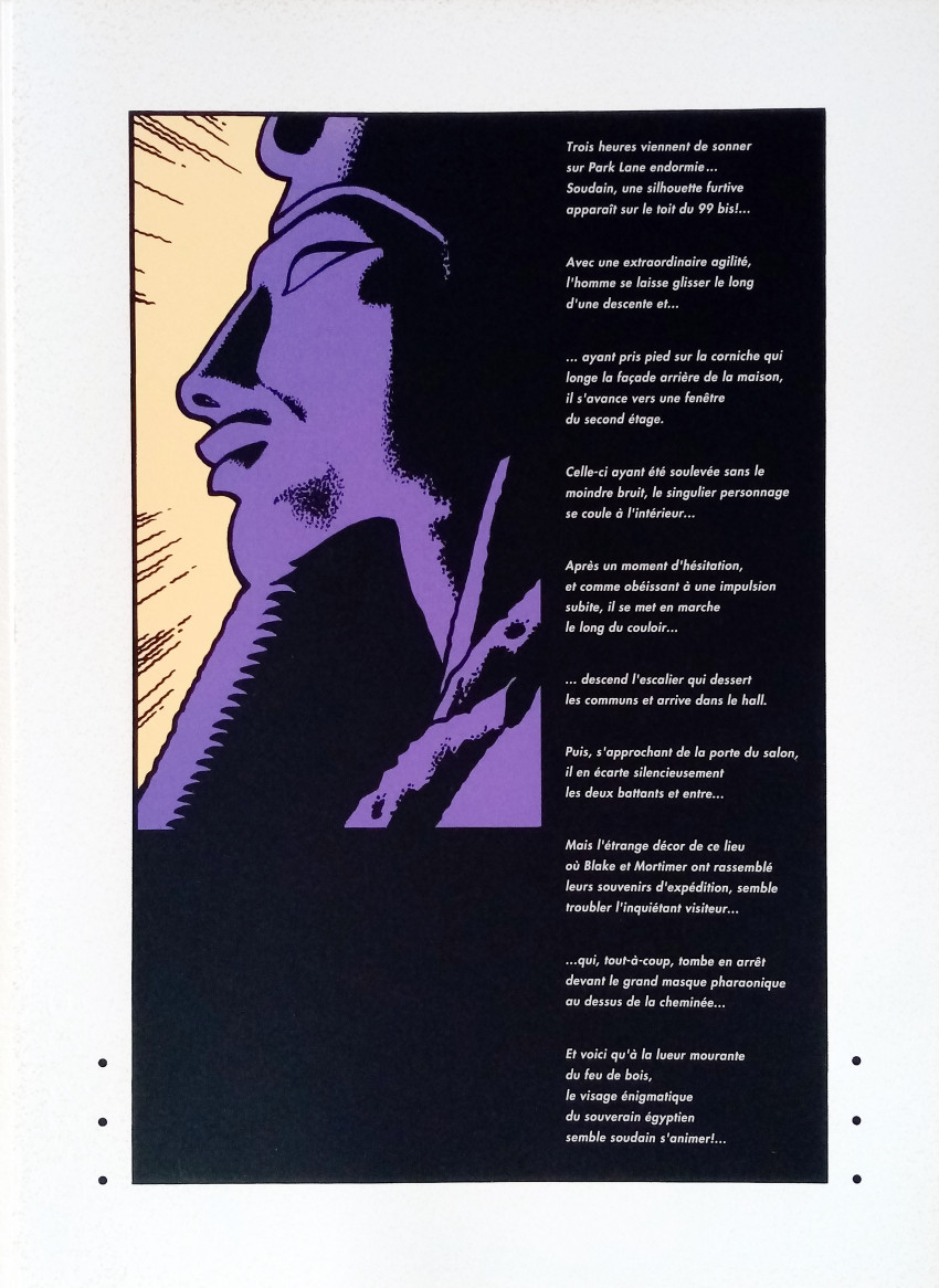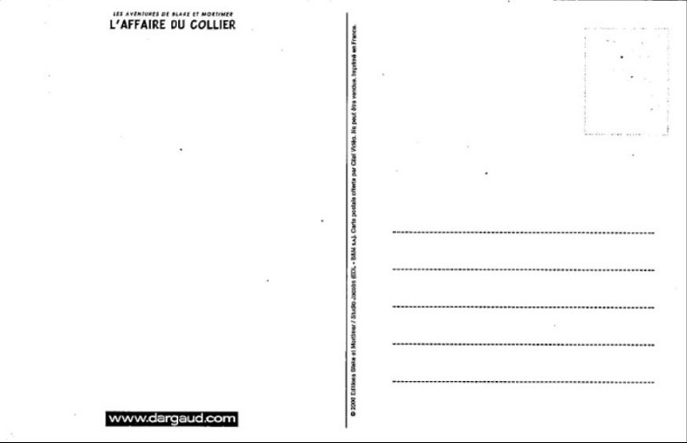 Commentaire : Numéro 2 de la collection. Adaptation de la bande dessinée de Jean Van hamme et de Ted Benoit à partir des personnages créés par Edgar Pierre Jacobs. Inclu une carte postale publicitaire "L'affaire du collier" avec un copyright pour l'année 2000.
