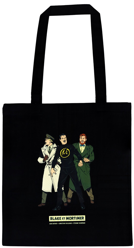 Commentaire : Sac type "Tote bag" en coton noir, floqué d'un côté. Les dimensions sont données sans les bandoulières. Distribué à l'occasion de la sortie du tome 27.