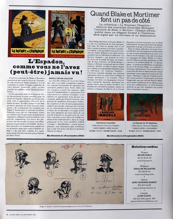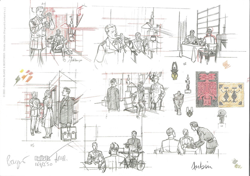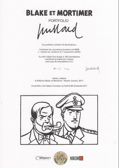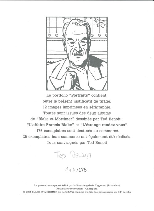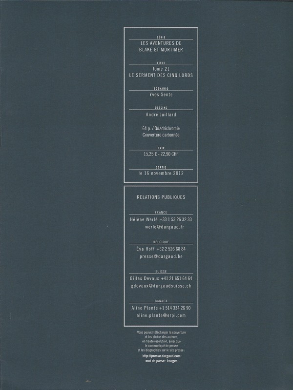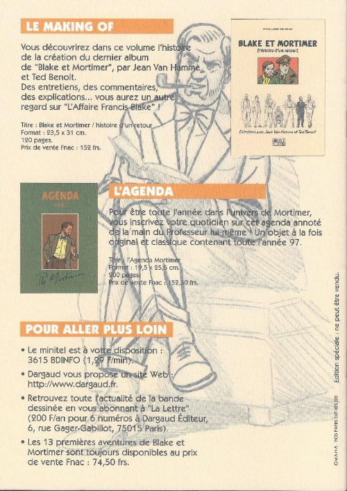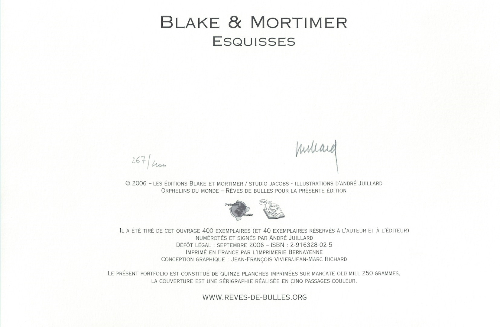 Commentaire : 32 pages, contenant des reproductions annoncées comme toutes inédites, de croquis, esquisses, études, crayonnés, essais de couvertures, toutes en grand format (une par page). Offert pour l'achat de deux albums de la série Blake et Mortimer dans les librairies participantes et dans la limite des stocks disponibles, à partir du 19 avril 2013.