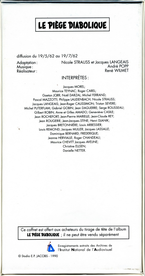 Commentaire : Coffret de 3 cassettes audio offert avec le tirage de tête du tome 9 (Le piège diabolique) de 1990. Feuilleton adapté de la BD, radiodiffusé de mars à avril 1962. Enregistrements extraits des archives de l'INA, Adaptation de Nicole Strauss et Jacques Langeais. Musique de André Popp. Réalisateur : René Wilmet.