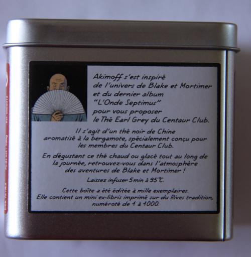 Commentaire : Boite métallique conçue par Akimoff (Paris), diffusée par parfum137, qui s'est inspiré de l'univers de Blake et Mortimer et du dernier album "L'Onde Septimus" pour proposer le Thé Earl Grey du Centar Club.