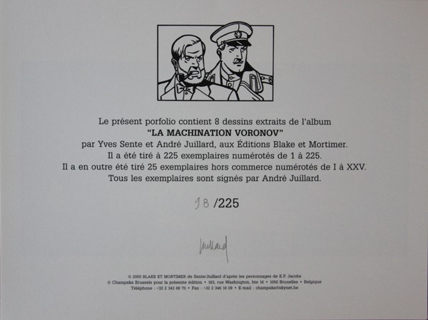 Commentaire : Cet ex-libris collé dans l'album fait partie de l'offre initiale, signé par André Juillart et Yves Sente. Un autre ex-libris numéroté à 69 exemplaires est réservé aux premiers souscripteurs.