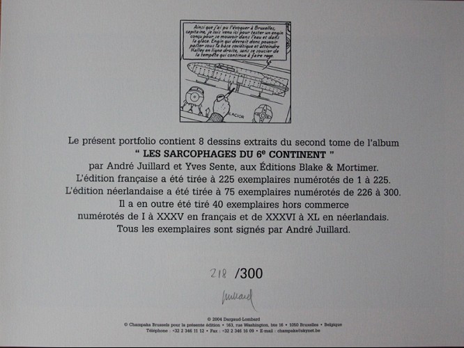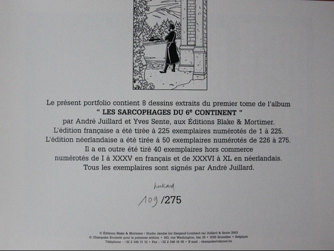 Commentaire : Cet ex-libris numéroté à 69 exemplaires est offert à l'achat du tirage limité du tome 1 des sarcophages du 6e continent. pour les 69 premiers souscripteurs. Le premier collé dans l'album fait partie de l'offre initiale, signé par André Juillard et Yves Sente.