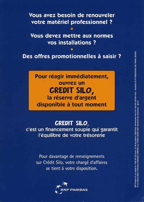 Commentaire : Publicité pour le nouveau crédit SILO à destination des entrepreneurs et professionnels libéraux. Publicité en 4 volets recto-verso avec un dessin sur le 3ème volet.